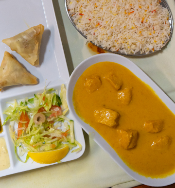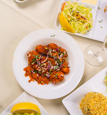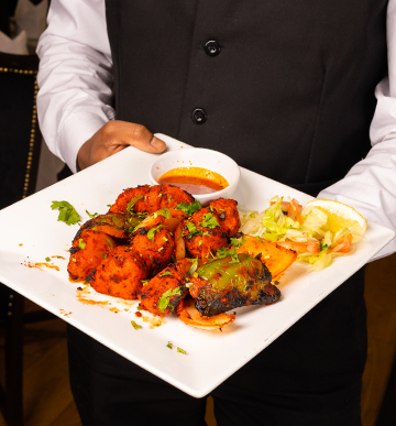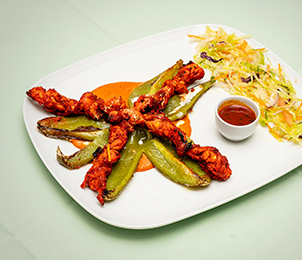 Chicken, lamb, paneer & salmon tikka, stir fried with green chilli, capsicum and onions, served with Amiri pilau